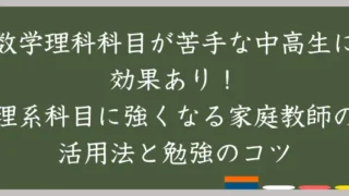 コラム 数学理科科目が苦手な中高生に効果あり!理系科目に強くなる家庭教師の活用法と勉強のコツ 数学や理科が苦手な中高生必見!理系科目に強くなる家庭教師の活用法と勉強のコツを紹介します。数学・理科・物理・化学の指導効果や苦手克服術、保護者ができる家庭学習サポートまで、成績アップにつながる実践法をわかりやすく解説します。 2024.11.23 コラム