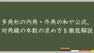 中学数学 多角形の内角・外角の和や公式、対角線の本数の求め方を徹底解説 中学2年で学習する平面図形を徹底解説。多角形の内角の和や外角の和、公式の意味と使い方、正多角形の性質、さらに対角線の本数を求める方法まで、わかりやすい例と丁寧な解説で整理しました。基礎から応用までをしっかり理解し、数学の力を伸ばしましょう。 2025.09.24 中学数学