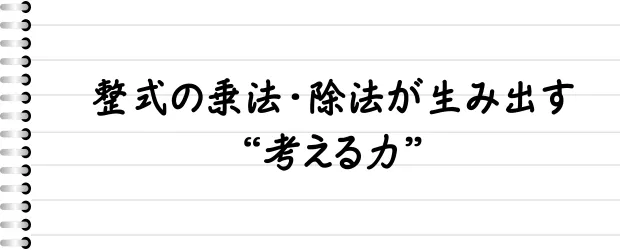 実際、整式の乗法は「組み合わせを広げて全体像をつかむ」思考、整式の除法は「全体を分けて整理する」思考を鍛えることにつながります。