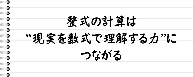 整式の計算を理解することは、単に「計算ができるようになる」ことではなく、現実の中の数量の関係を読み解く力を養うことにつながります。
