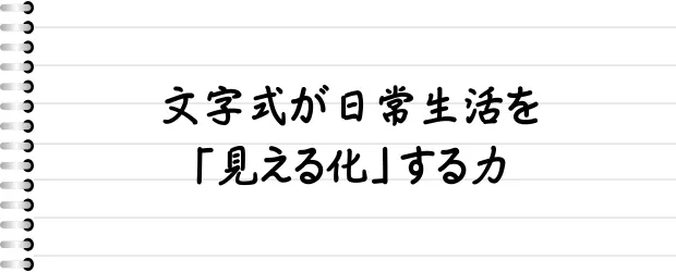 つまり、文字式を使って日常の出来事を見える化する力を身につけることが、第一歩です。